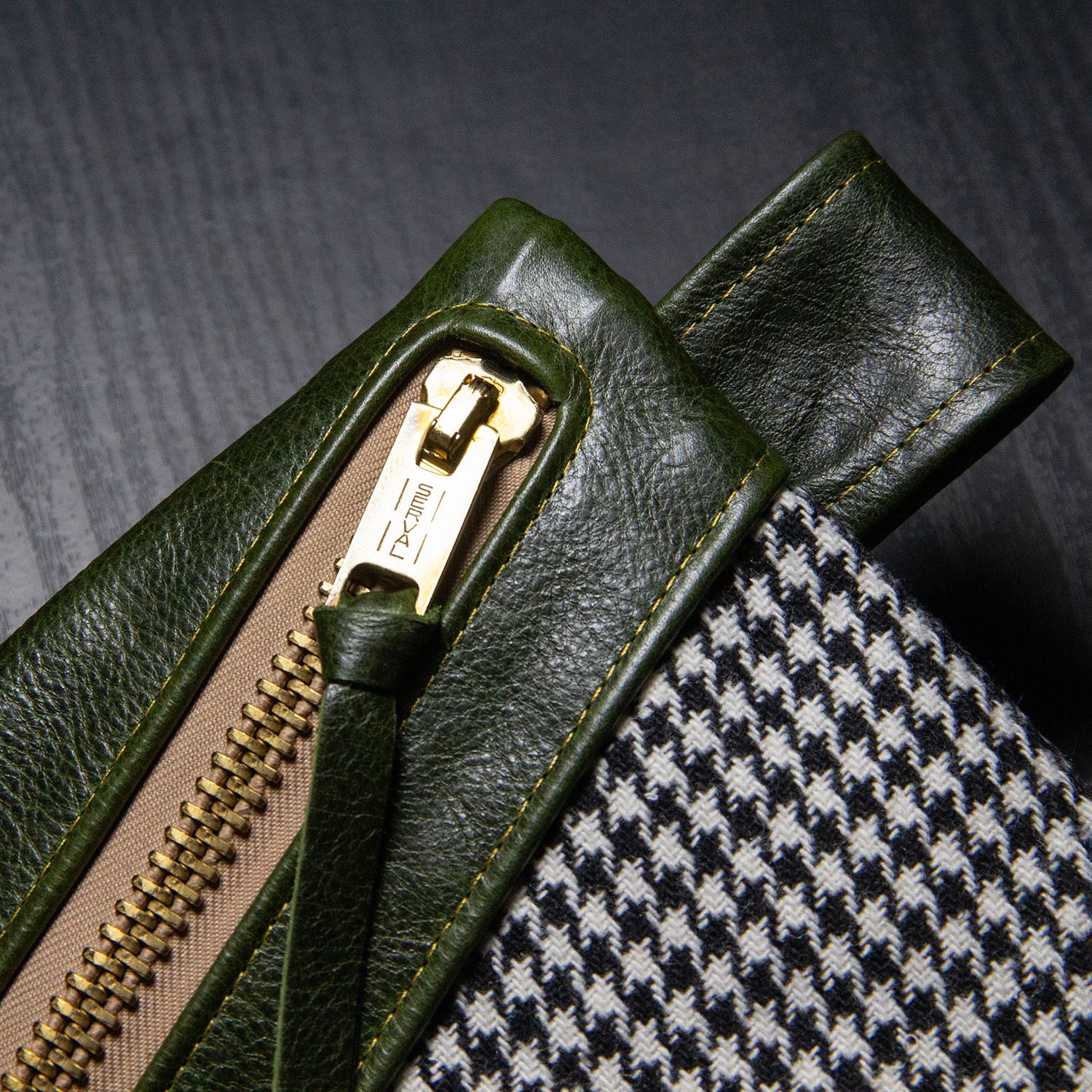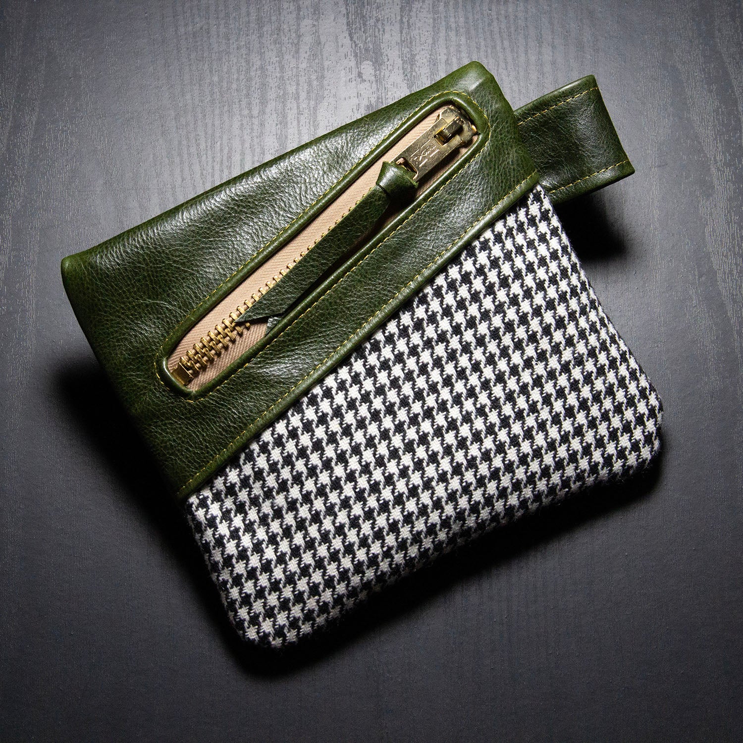 Constructed of buttery soft, full grain leather and Italian woven wool houndstooth (front)