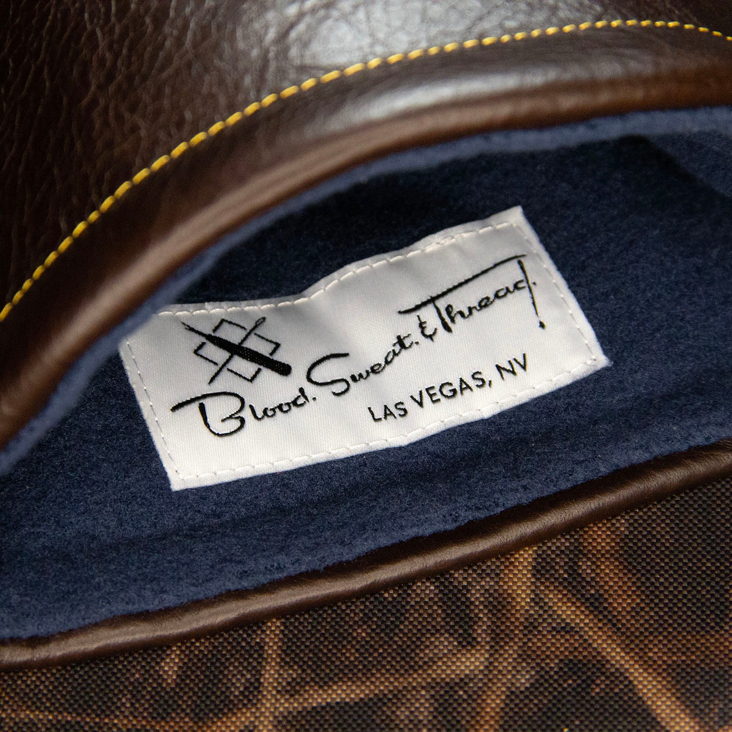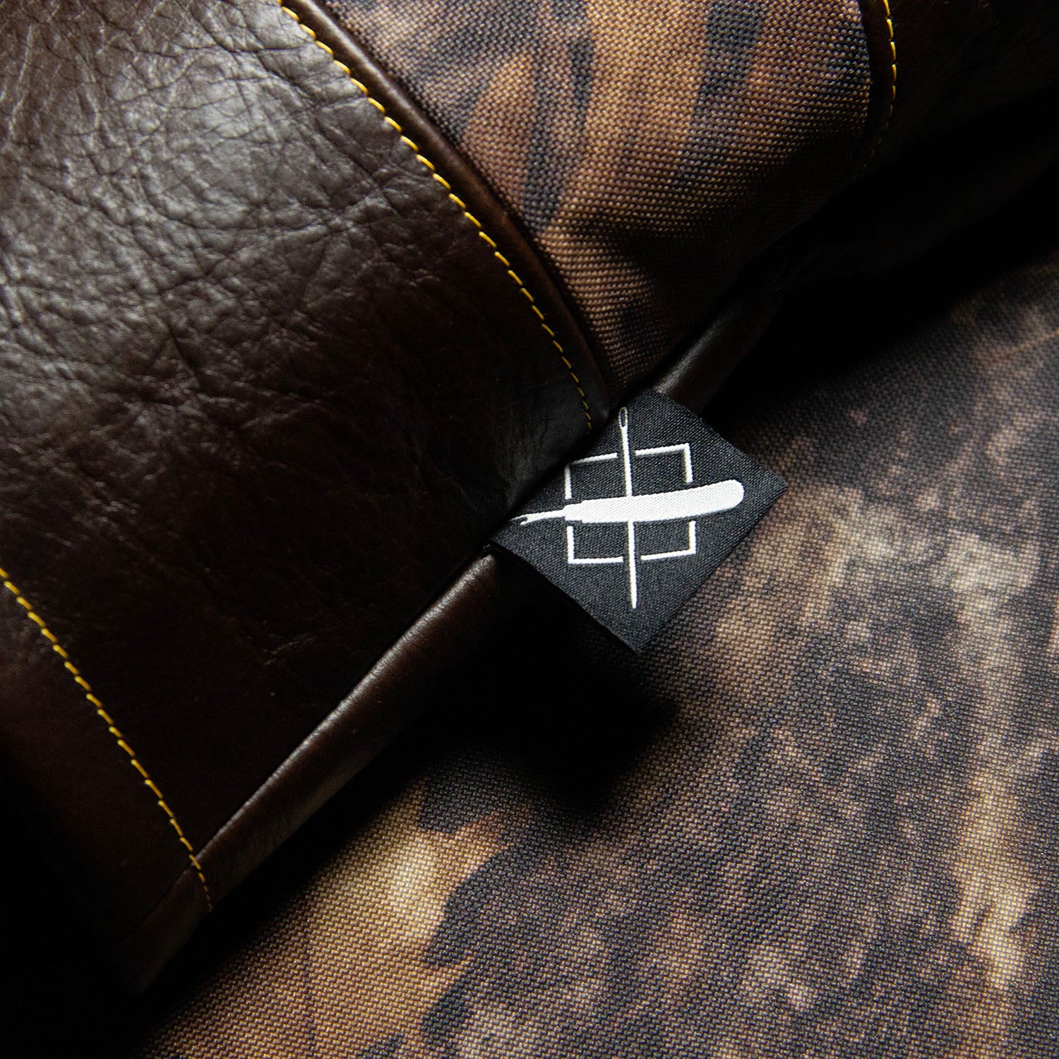 - Belgian chocolate leather has a slightly waxy finish and natural texture. Timber print woven cordura.